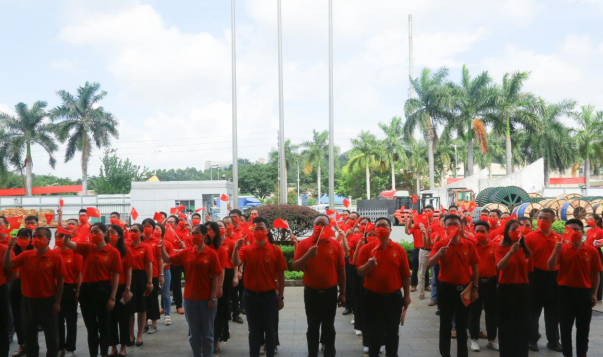 盛夏七月,热情似火!通宝TB888公司已是党旗飘扬,处处洋溢着喜庆祥和的气氛。当日上午,身穿“中国红”T恤的党员等参会人员有序入场,列队数字“100”庆祝图案,表达对中国共产党的无限热爱。随着主持人一声令下,伴随着激昂雄壮的国歌声,护旗手奋力将鲜艳的五星红旗抛向天空,国旗迎着清晨第一缕阳光冉冉升起,全体人员庄重注视国旗,高唱国歌,脸上写满了骄傲与自豪。